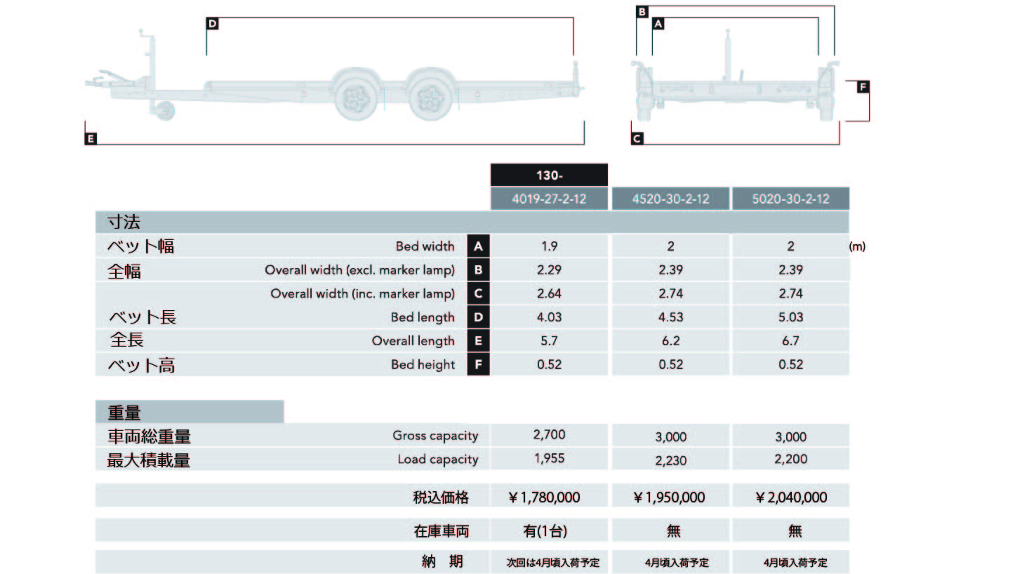 基本は950登録での予備検査付きでのお渡しになりますので 約1200kg の最大積載量となります。上の表に記載の最大積載量まで取得する場合は優秀な牽引車両+連結検討書類の作成・手配(別途費用)が必要となります。ご相談下さい。